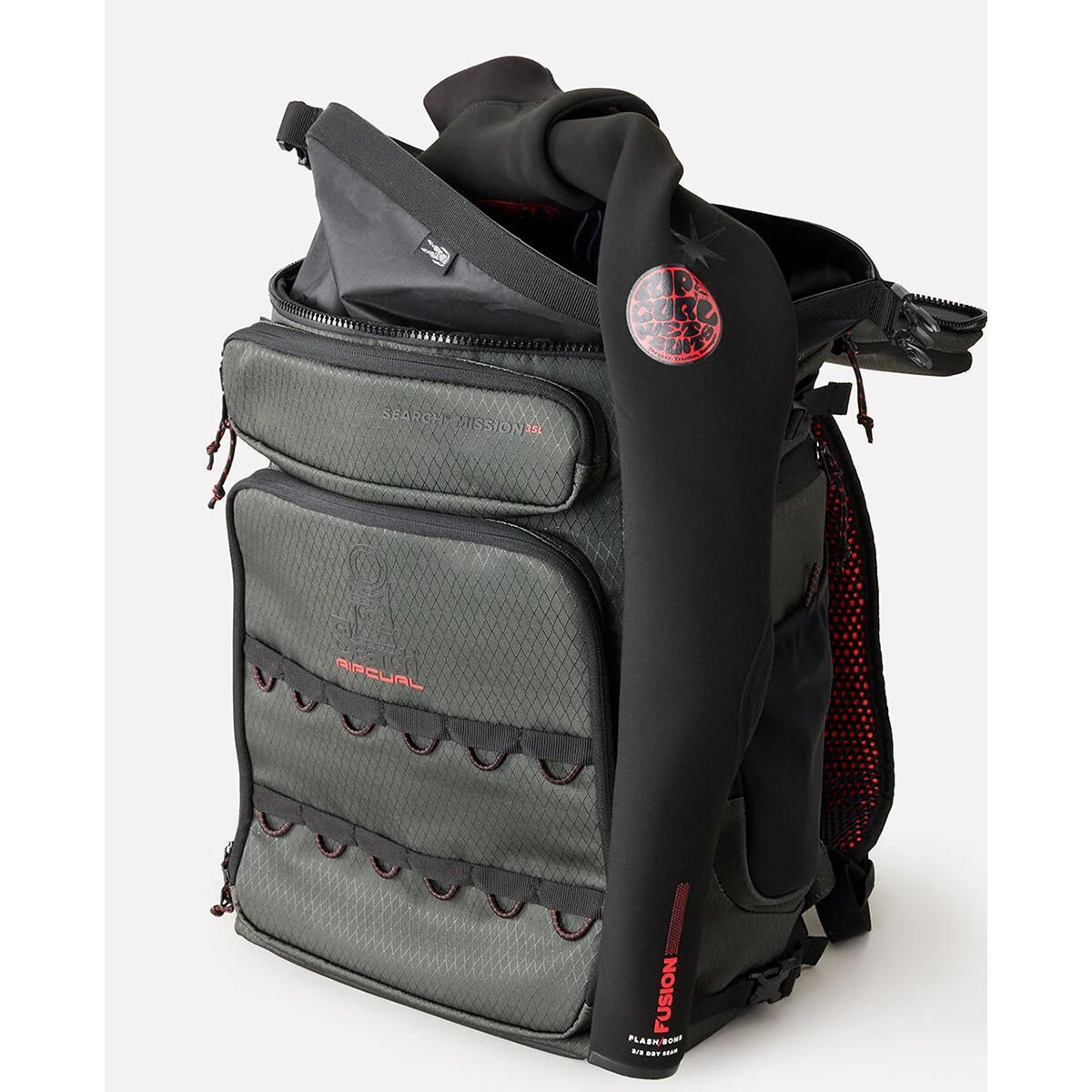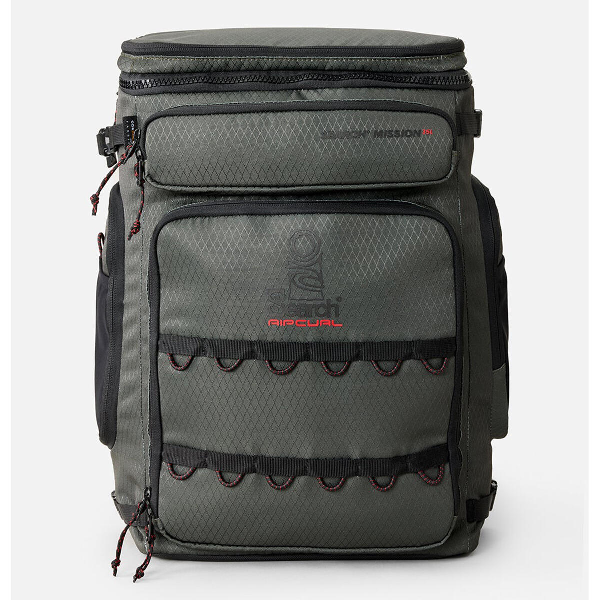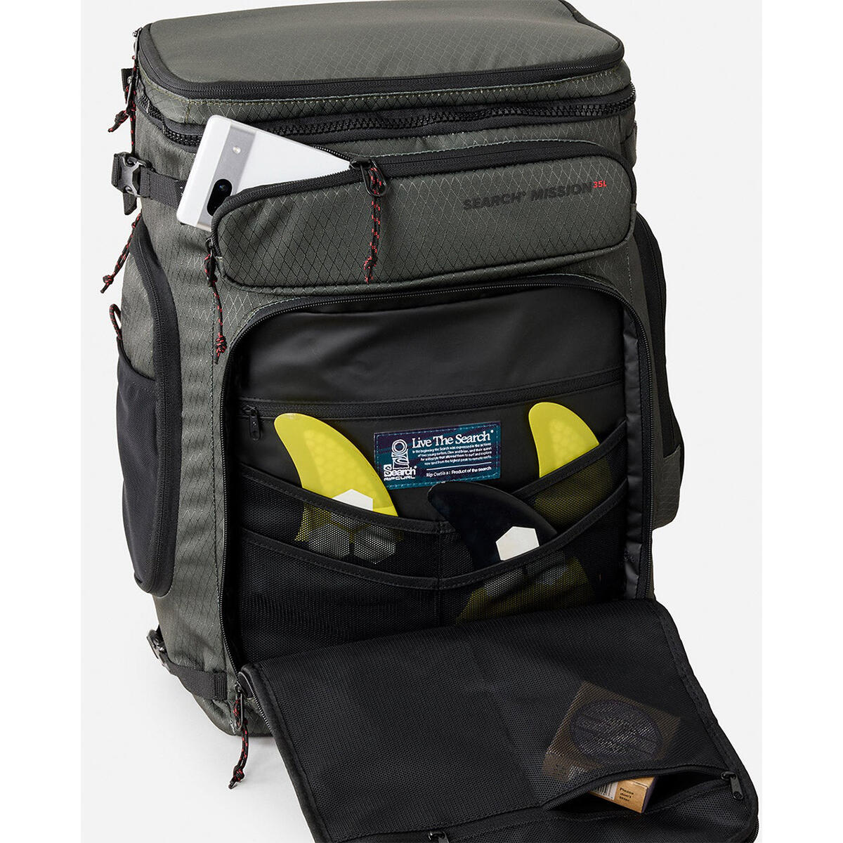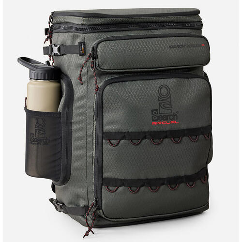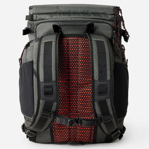 Search Mission 35L Cordura Backpack is built tough with eco Cordura diamond ripstop, padded back panel, laptop and tablet sleeve, wet/dry section, and compression straps for surf-ready durability.