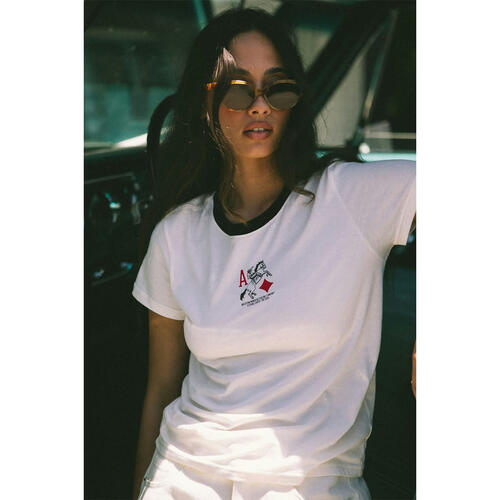 Add a playful touch to your wardrobe with the Aces Fitted Crew T-shirt. Crafted from a lightweight yet substantial 135 GSM cotton jersey, it offers a flattering slim silhouette that skims the body without clinging. The front is adorned with a screen-printed ace of diamonds motif, and a contrasting neckline trim lends the finishing touch. Perfect for everyday wear, this quality cotton tee layers beautifully or can be worn alone.