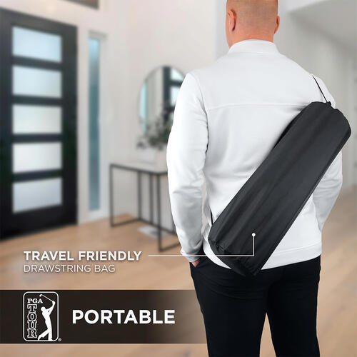 - Deluxe Putting Mat: Featuring a full size hole target and guidelines, it is the perfect putting green for your home. Its compact size and included carry bag make it easy to set up and store away.