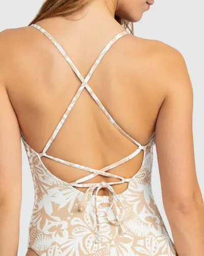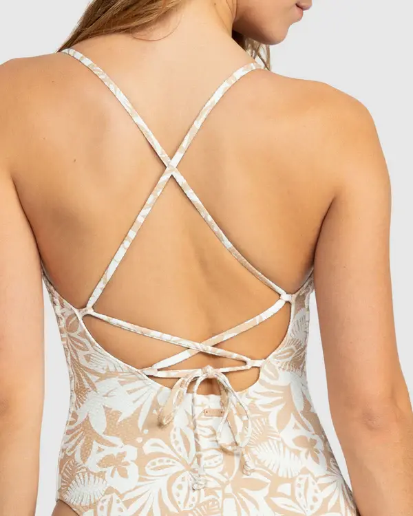 Roxy's swimwear at its finest, you'll dive into unique style with this Palm Paradise one-piece. Made from recycled nylon blend fabric, it features adjustable knotted straps and a flirty criss-cross back. With removable pads and moderate coverage, it's perfect for A to C cups