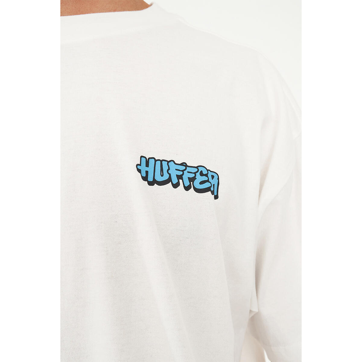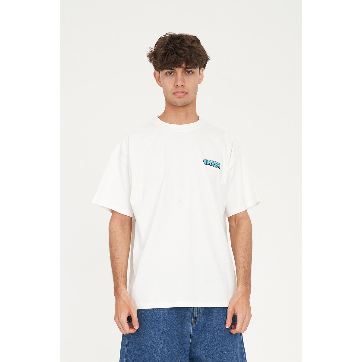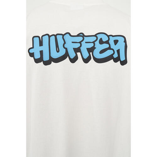 What you need to know: 100% Cotton, 220gsm, 25mm Neck rib, Premium weight jersey, Boxy fit, Short sleeve, Huffer branded placement screenprint