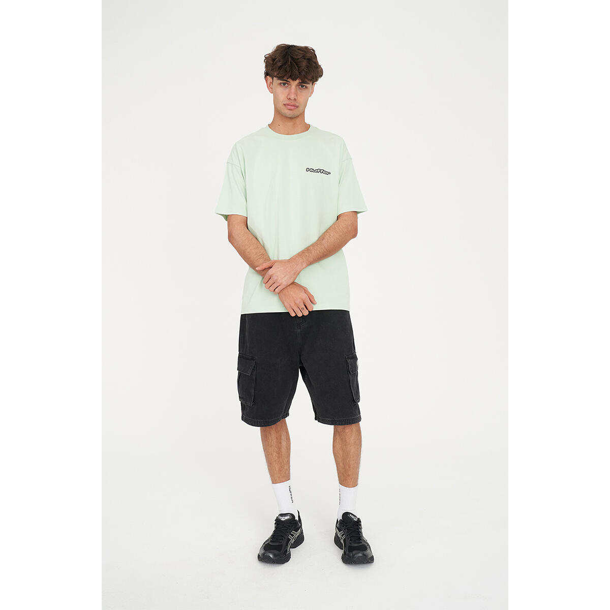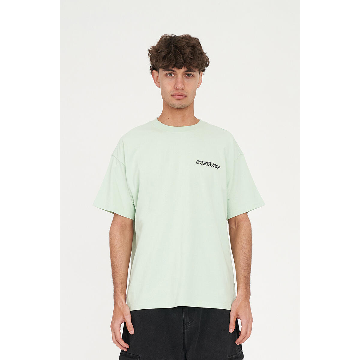 What you need to know: 100% Cotton, 220gsm, 25mm Neck rib, Premium weight jersey, Boxy fit, Short sleeve, Huffer branded placement screenprint