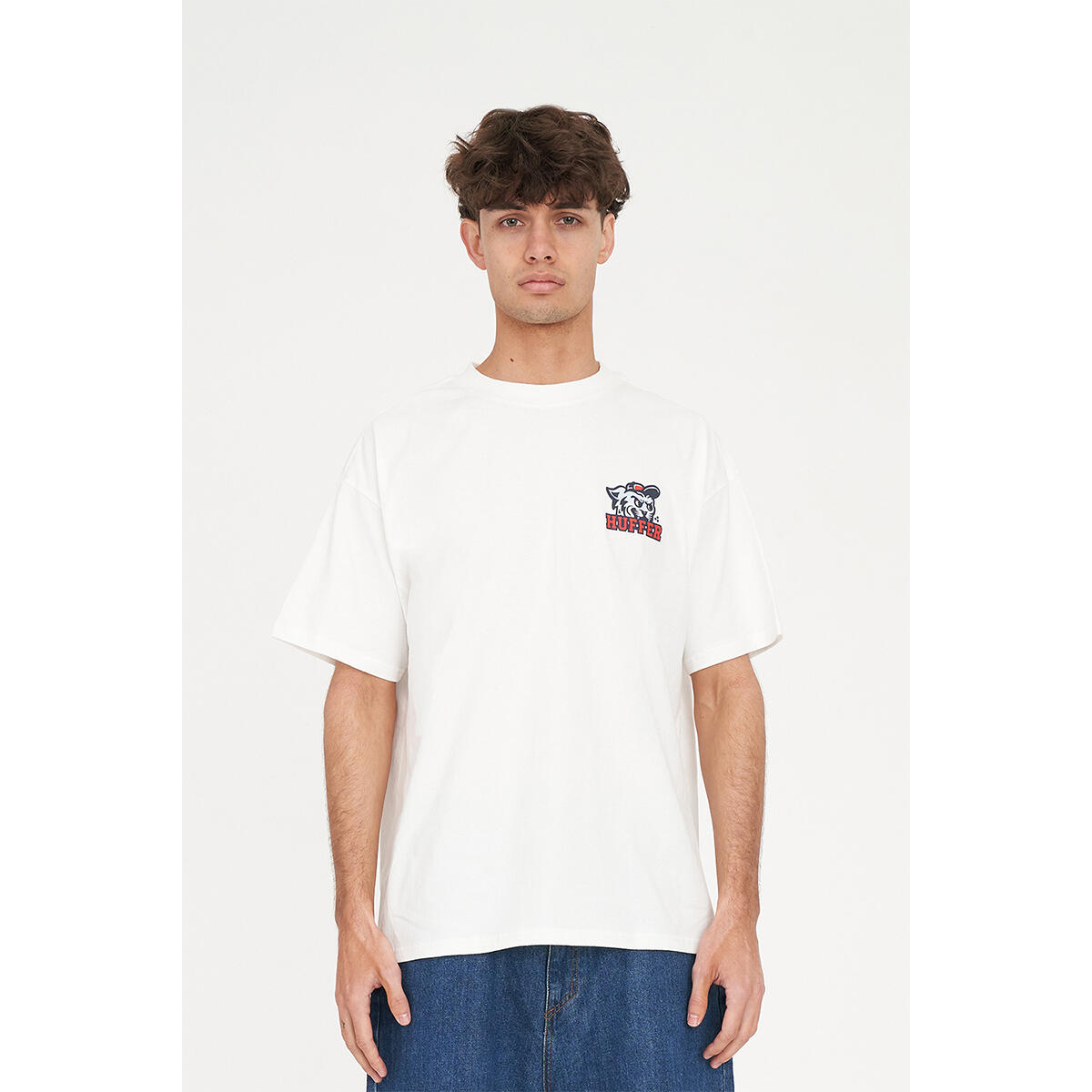 What you need to know: 100% Cotton, 220gsm, 25mm Neck rib, Premium weight jersey, Boxy fit, Short sleeve, Huffer branded placement screenprint