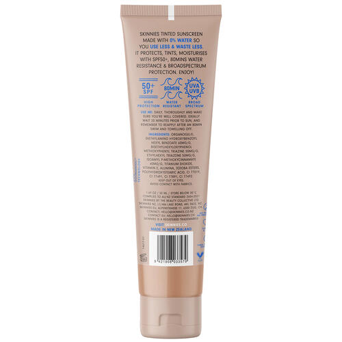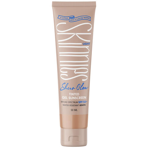 Your all-in-one summer skin solution! Skinnies Sheer Glow Tinted Gel Sunscreen SPF50+, available in Light, Medium & Bronze will leave you with a beautiful healthy glow, providing a natural looking coverage as well as protection. It's sustainably made using ZERO water, so less is more. Provides 80 minutes water resistance. Skinnies recommends protecting against long-term effects of the sun by reducing exposure in the middle of the day, and combining this with shade, a sun hat, adequate clothing, sunglasses and most importantly a high protection sunscreen, like Skinnies! Vegan. Cruelty Free. Gluten Free. Sugar Cane Tubes. Hawaii Act 104 Reef Compliant. Free from Parabens, Preservatives and Silicones. Made in New Zealand.