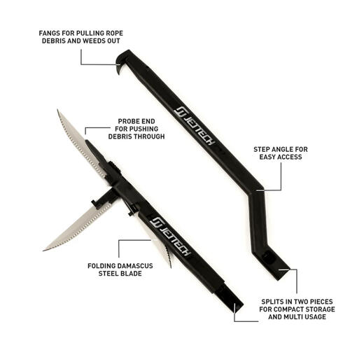 Engineered from tough, ceramic-reinforced nylon and equipped with a razor-sharp fold-away, Damascus steel blade, this tool handles the messiest intake jams with ease. The dual-purpose head features a probe tip end for pushing through debris and fangs at the other end for pulling out tangled ropes or weeds. It's compact, lightweight, and splits in two for easy storage in your seat or front hatch.