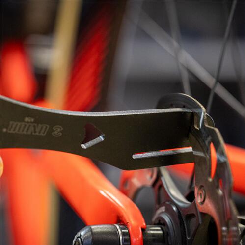 A disc brake rotor truing fork is designed to straighten bent or warped disc brake rotors. The tool ensures proper alignment of the rotor for optimal braking performance and prevents rubbing against the brake pads. Different notches on the tool allow access to the disc brake rotor from various angles and directions, enabling precise and accurate truing. It is compatible with rotors up to 2.4mm thick, making it compatible with a wide range of bicycle disc brake systems.
