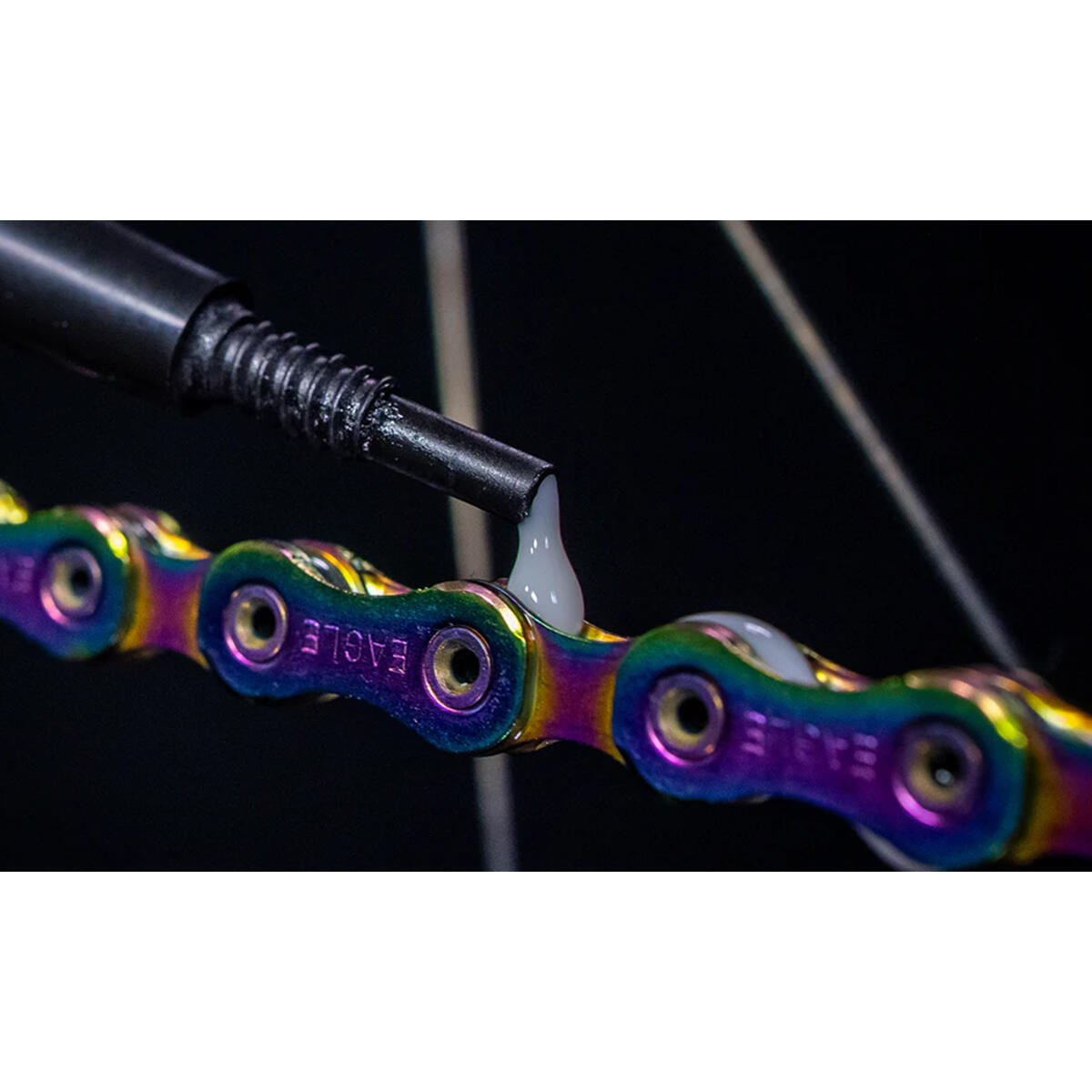 - Apply a moderate amount of Dry Lube to the inside chain link while spinning pedals in a reverse motion