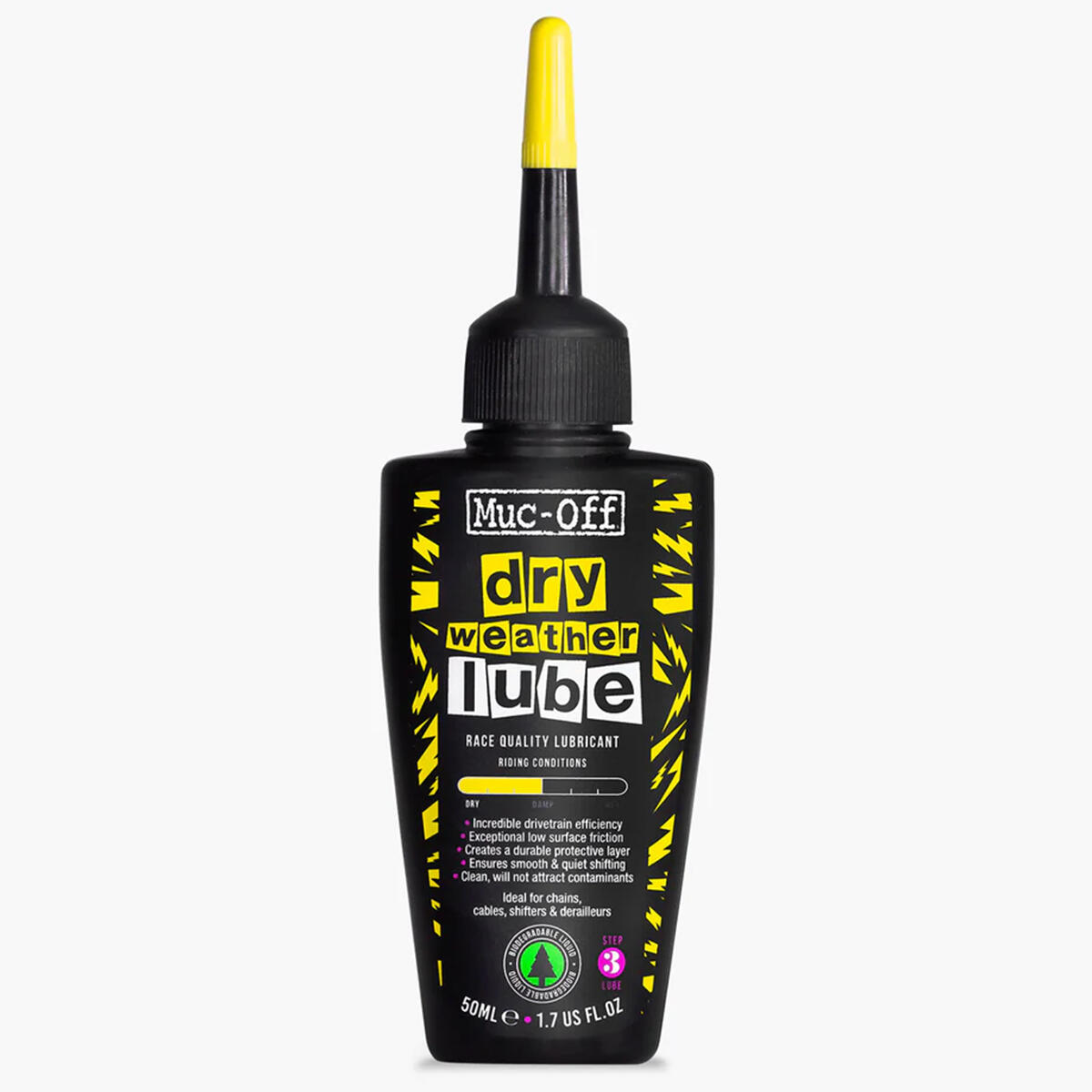 Muc-Off Dry Chain Lube is a durable, deep penetrating chain lubricant that's formulated to hold up in extreme conditions that would destroy ordinary chain lubes. Muc-Off Dry Lube is a highly versatile, dry weather chain lube that has state of the art penetrative qualities to ensure that the lube is driven deep into each chain link’s core. And there’s no need to worry because Muc-Off Dry Lube is biodegradable*, so it’s safe for you, your bike, and the planet.