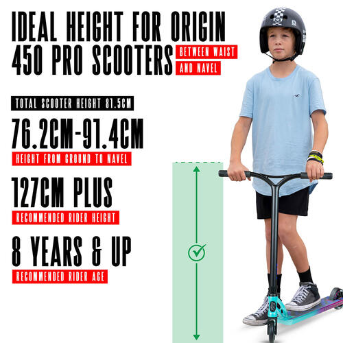 The Origin 450 is a compact but?high-performance park scooter, designed for younger riders who are already riding at an advanced level. Best suited to riders?around 127cm tall and up, it delivers pro-level strength in a smaller, more manageable size.