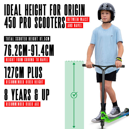 The Origin 450 is a compact but?high-performance park scooter, designed for younger riders who are already riding at an advanced level. Best suited to riders?around 127cm tall and up, it delivers pro-level strength in a smaller, more manageable size.