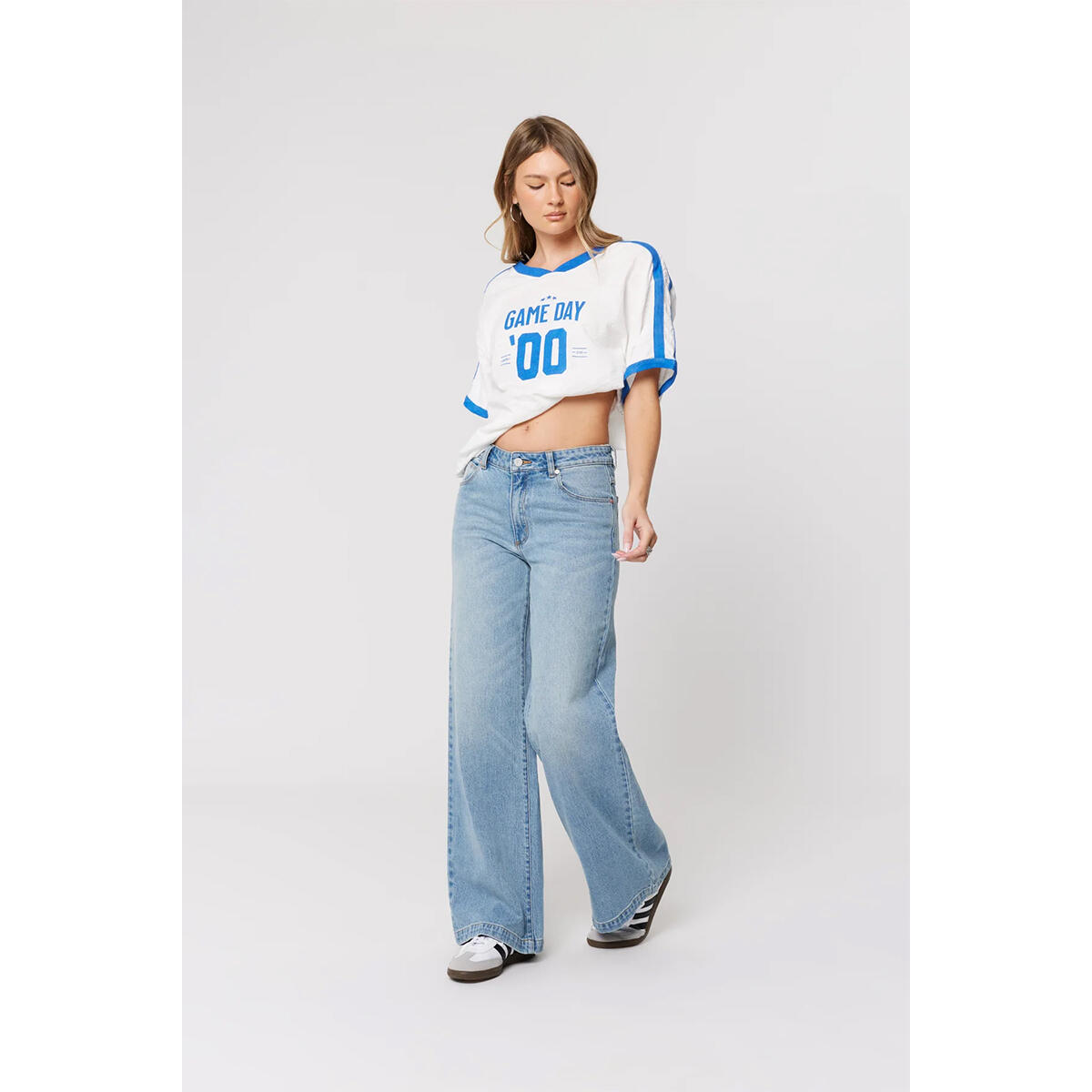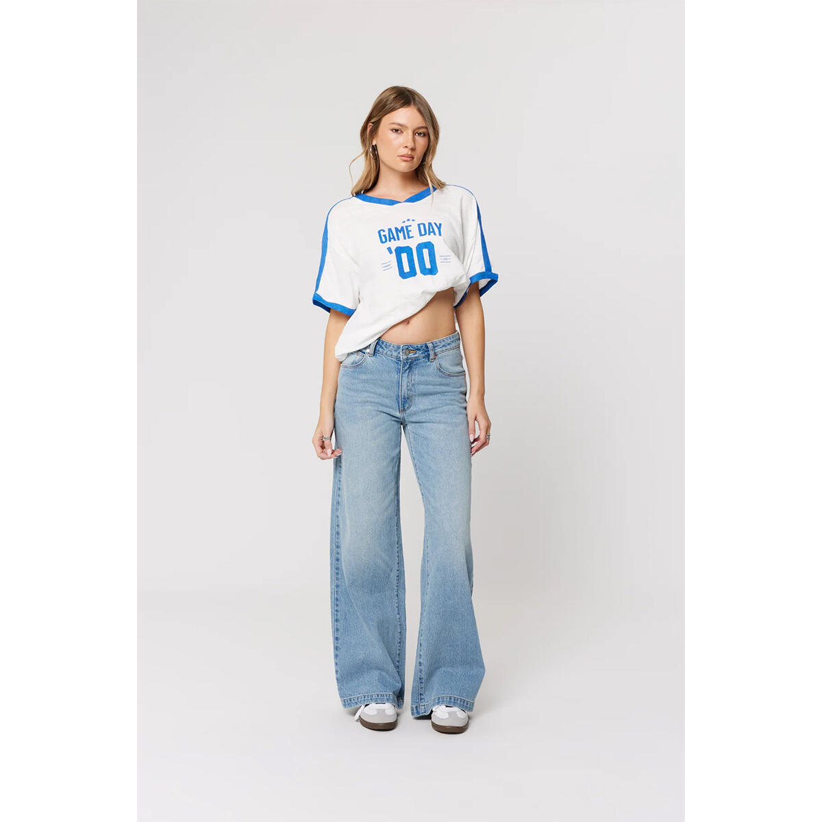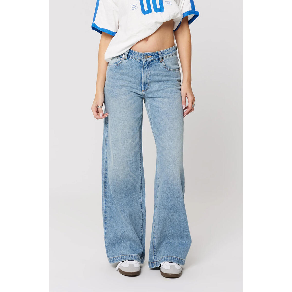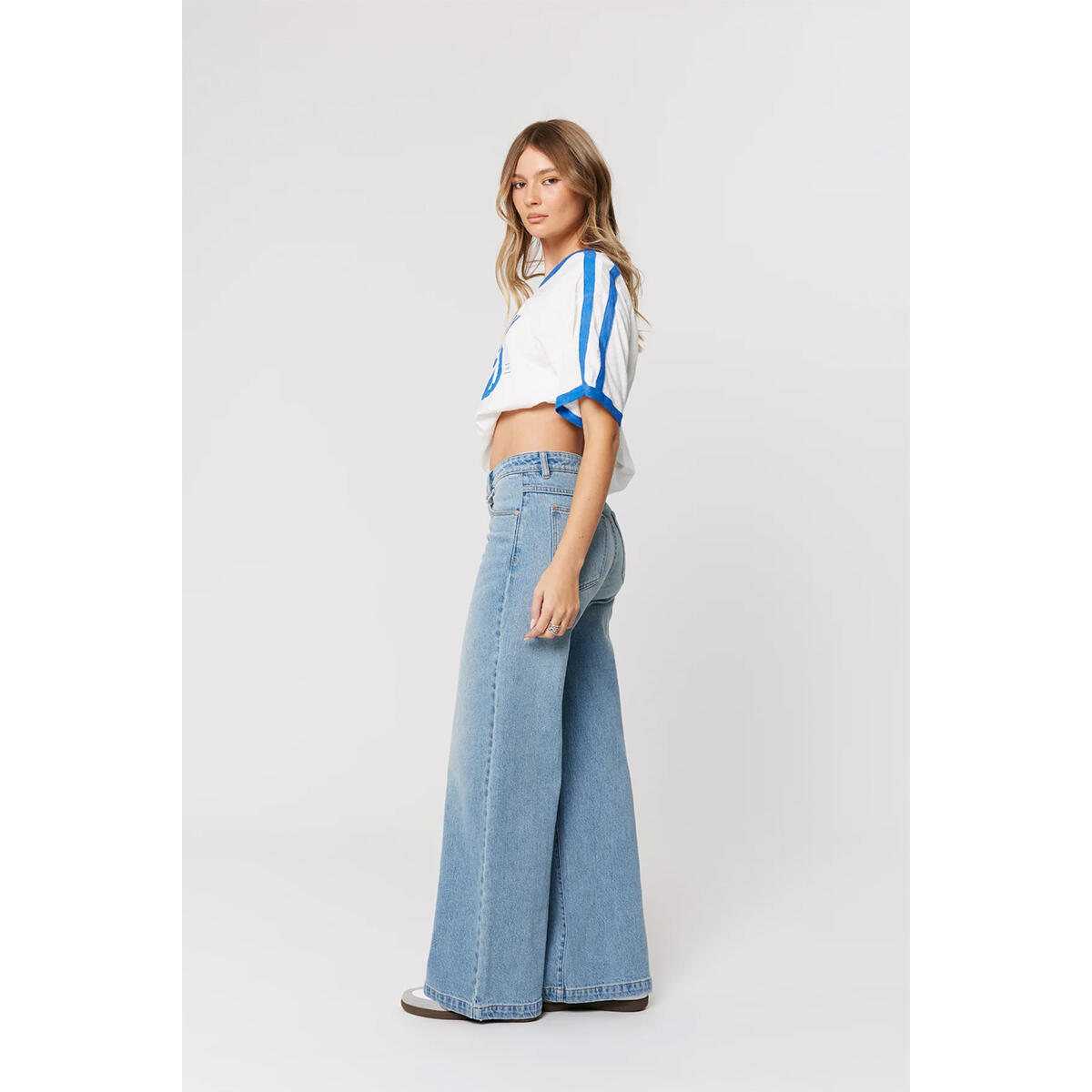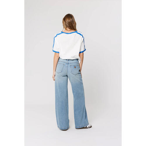 These jeans feature a mid-rise waist that sits just below the belly button, hugging through the hips and thighs before dropping into a wide leg from the hip for a clean, elongating silhouette.
