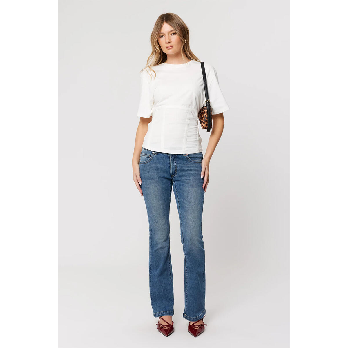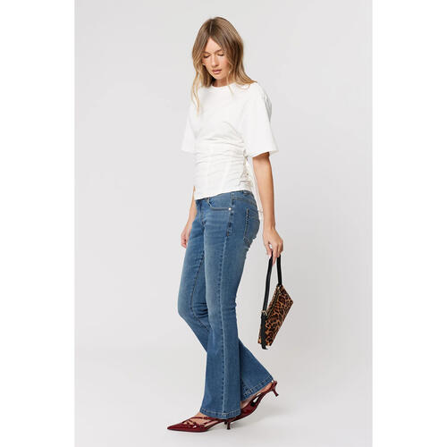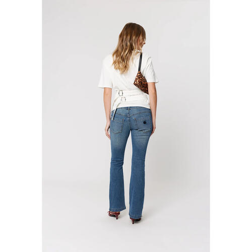 Style with a fitted baby tee or ribbed tank to show off the low rise, then add heels or boots to let the bootcut do its thing.