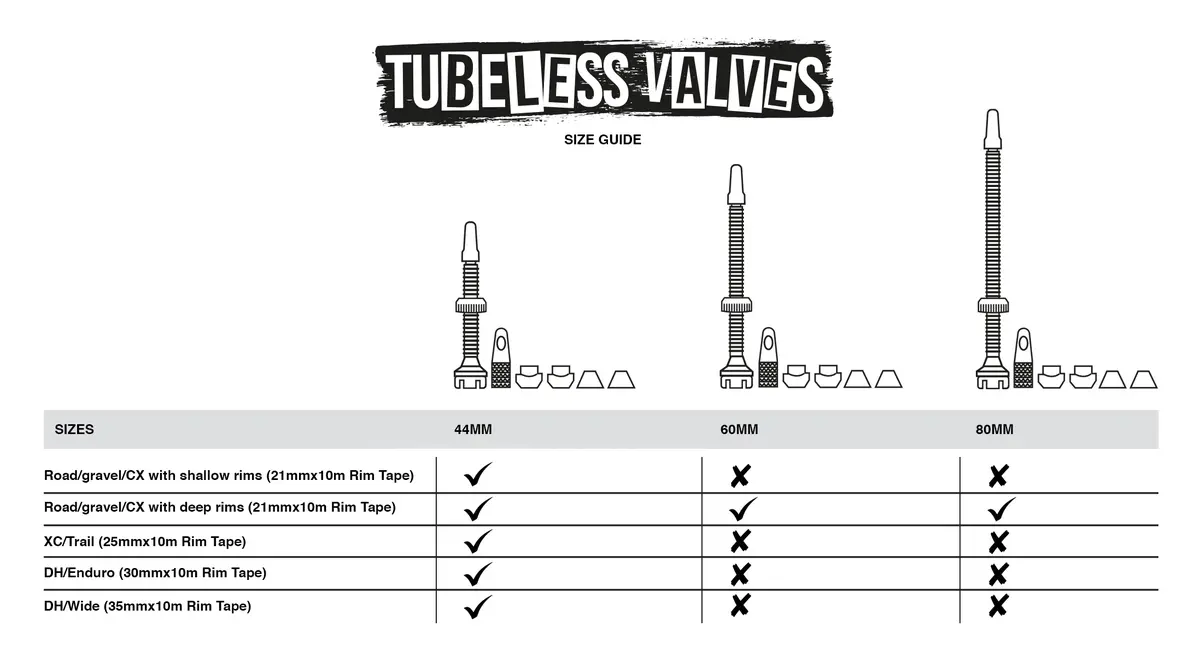 Road/gravel/CX with deep rims (60mm tubeless valves and 21mm x 10m Rim Tape)