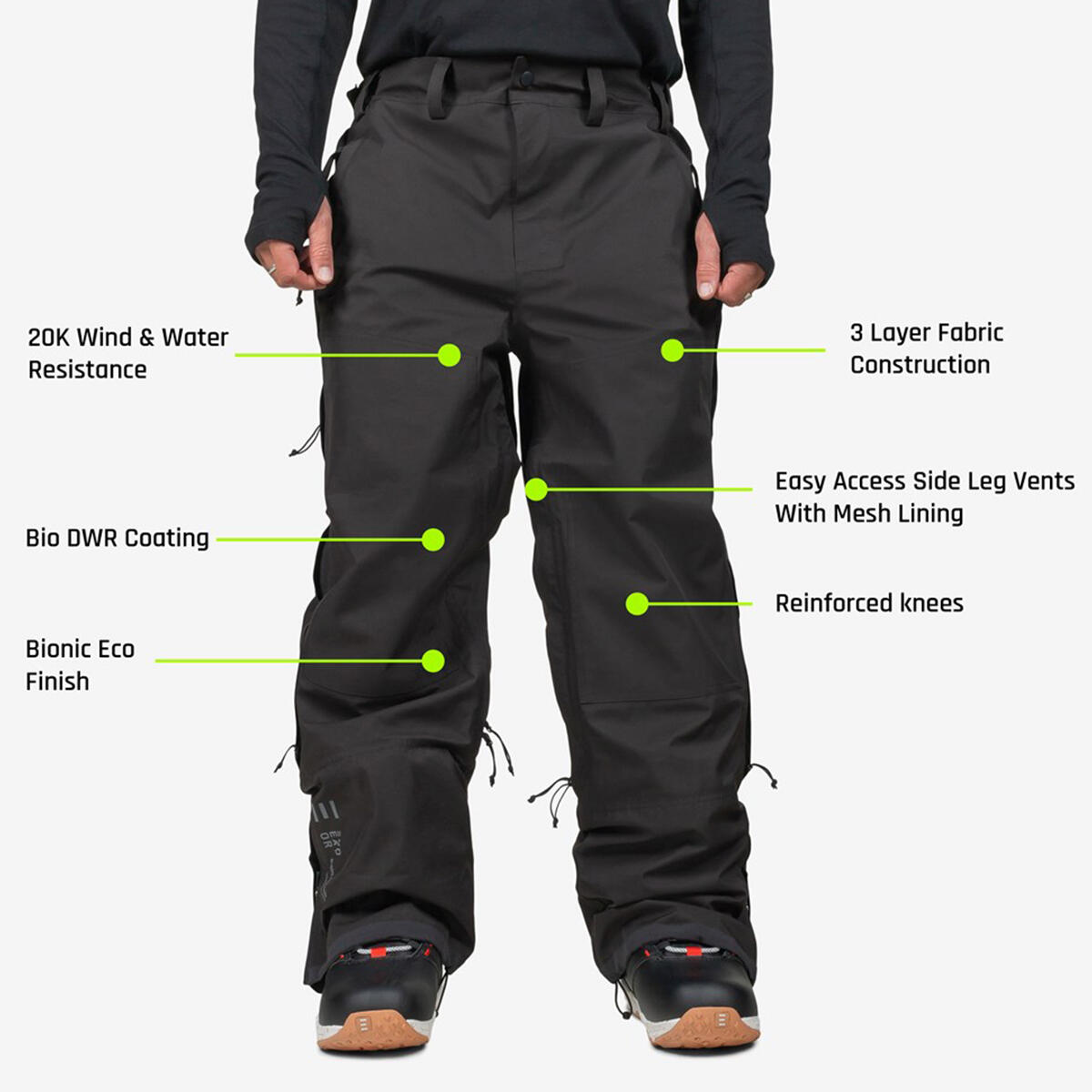 Reinforced knees and extra thigh layers provide added protection on chairlifts, while side leg vents, elasticated leg gaiters, and volume-expanding boot cut zippers offer breathability and versatility.